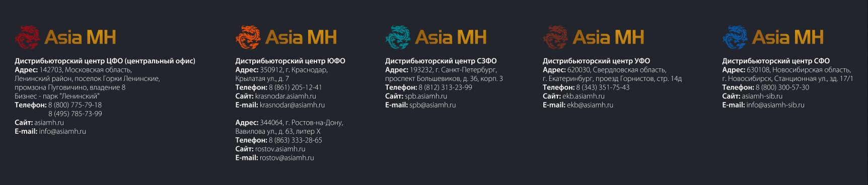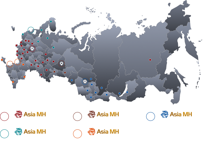 Компания Asia MH представлена пятью структурными подразделениями – дистрибьюторскими центрами в крупных городах России: в Центральном, в Северо-Западном, в Южном, в Уральском, в Сибирском федеральных округах, что позволяет компании быть ближе к своим клиентам и оперативно решать задачи по поставке подъёмно-транспортного и складского оборудования HELI, запасных частей и расходных материалов.